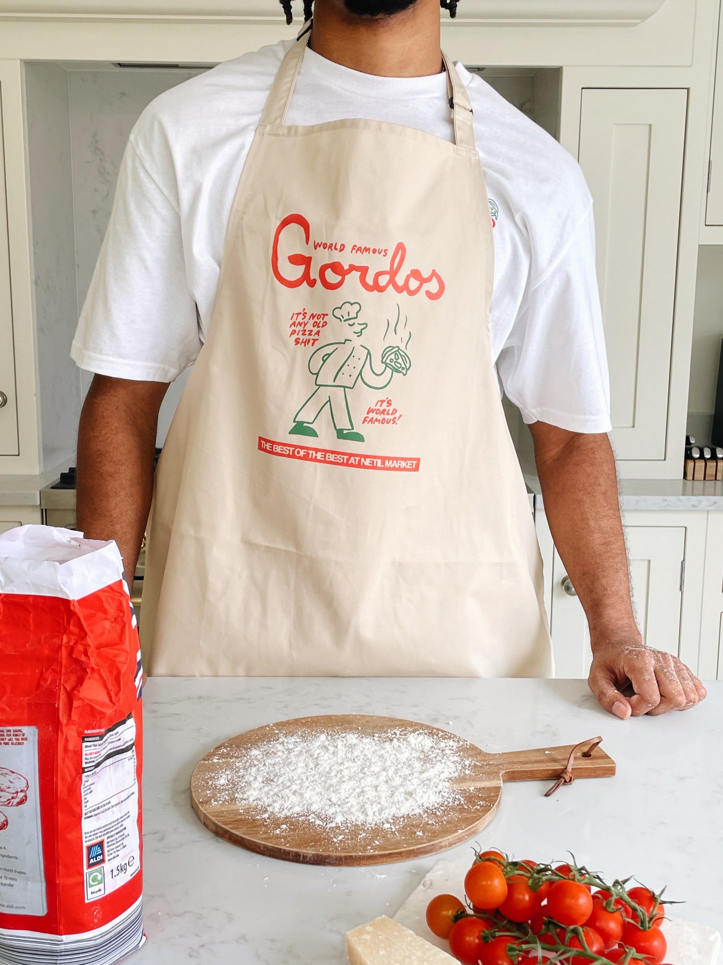 Along with the new tee, we're introducing an apron featuring the same design. Picture yourself firing up the pizza oven in the garden with your friends on a summer evening. They're world-famous for a reason—give them a try.