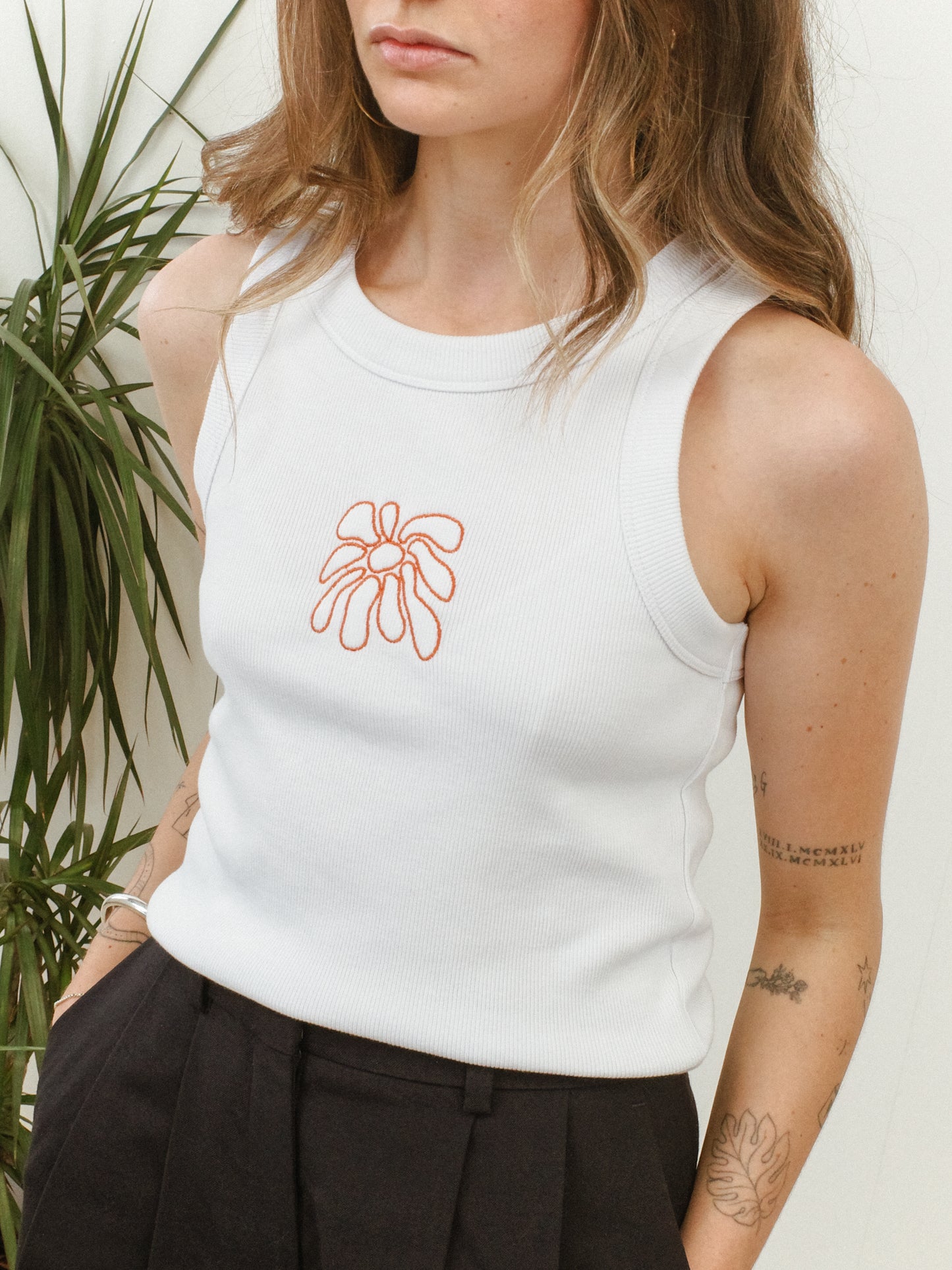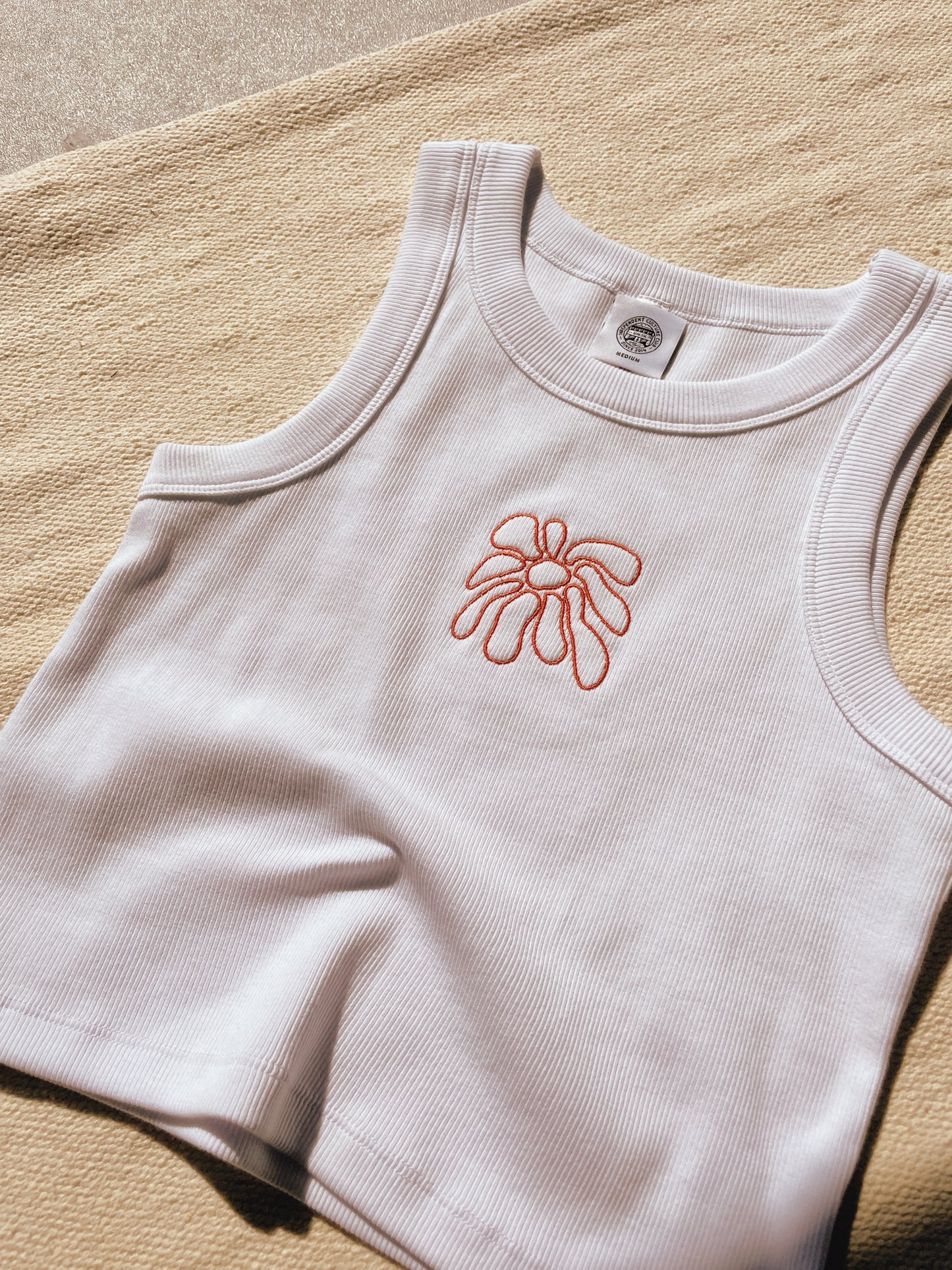 FABRIC: HEAVYWEIGHT 330GSM 95% ORGANIC COTTON 5% ELASTANE. SELF FABRIC WIDE BINDING, 2X2 RIB, CROP LENGTH. PRE-SHRUNK TO MINIMISE SHRINKAGE.