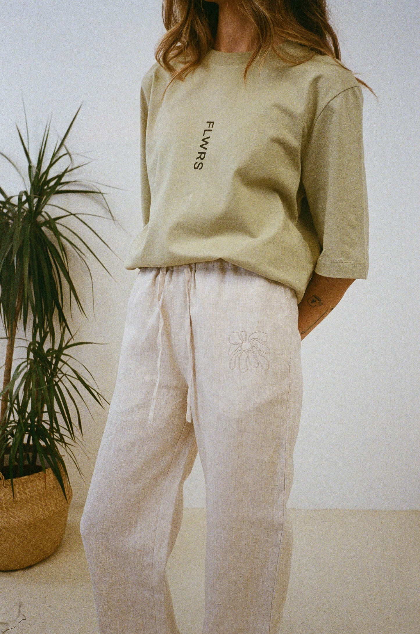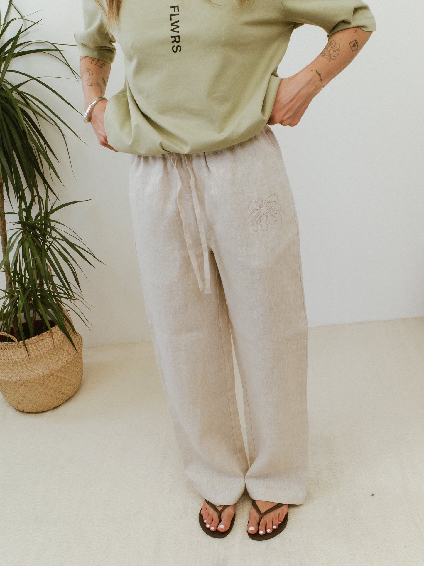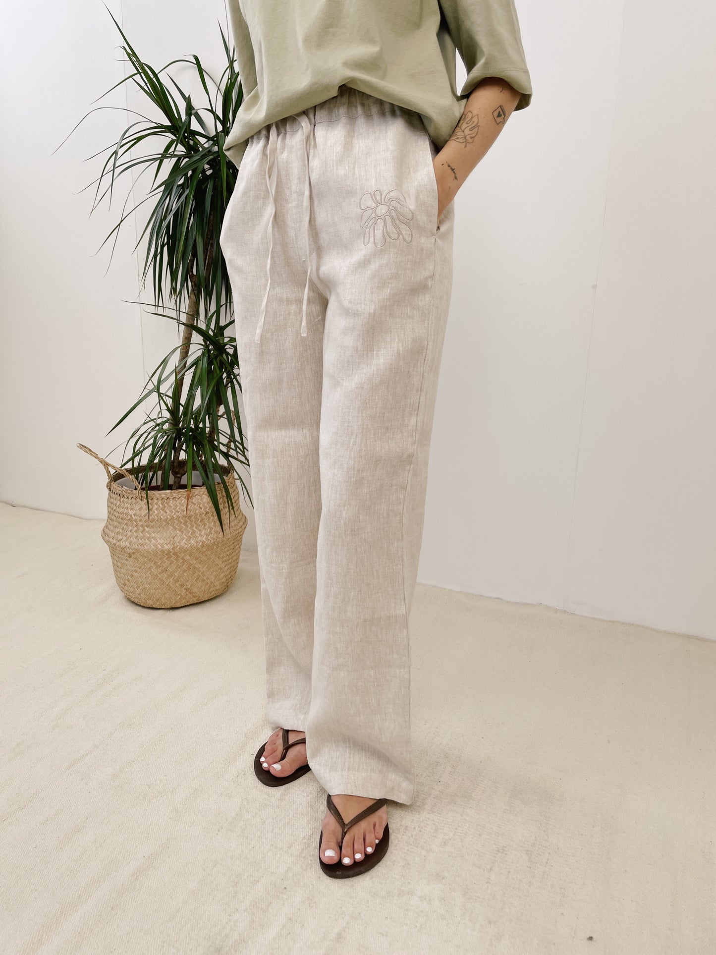 FABRIC: 215GSM 100% LINEN. TONAL DRAW STRINGS. SIDE SEEM POCKETS.